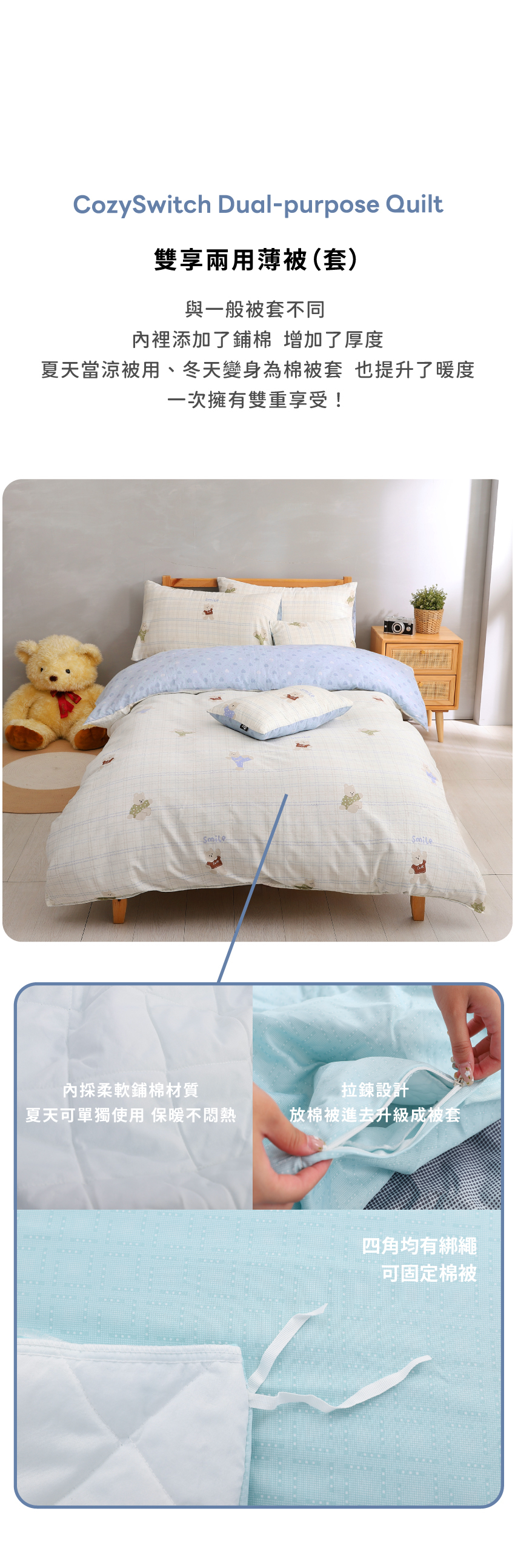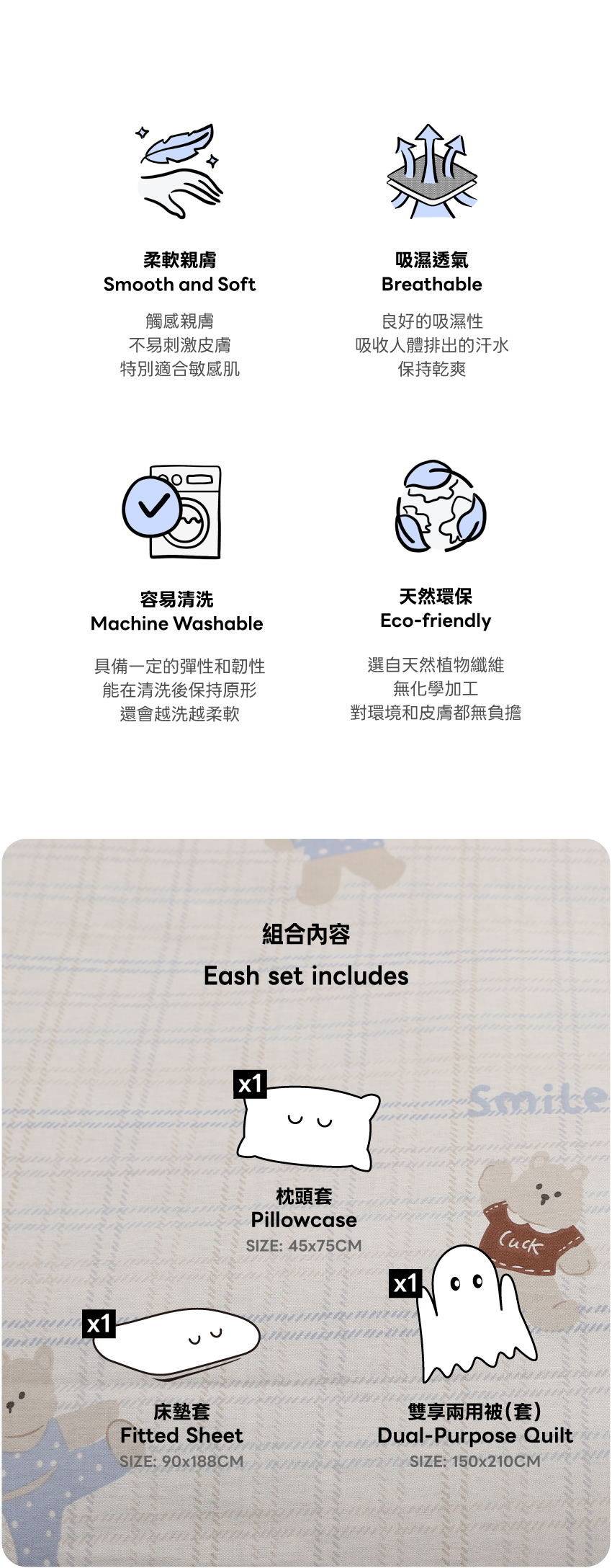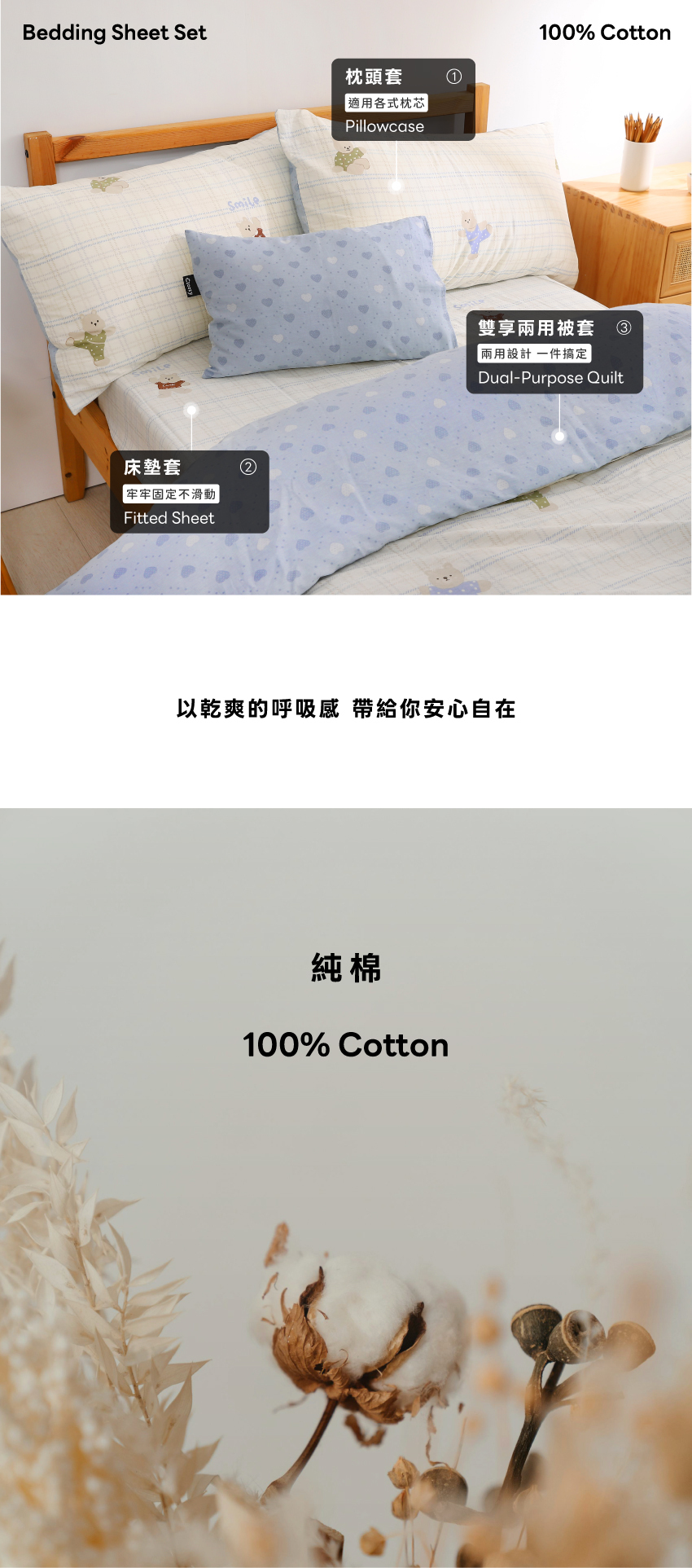 100%純棉材質,四季皆宜,柔軟透氣,讓每一夜都回歸純粹舒適!